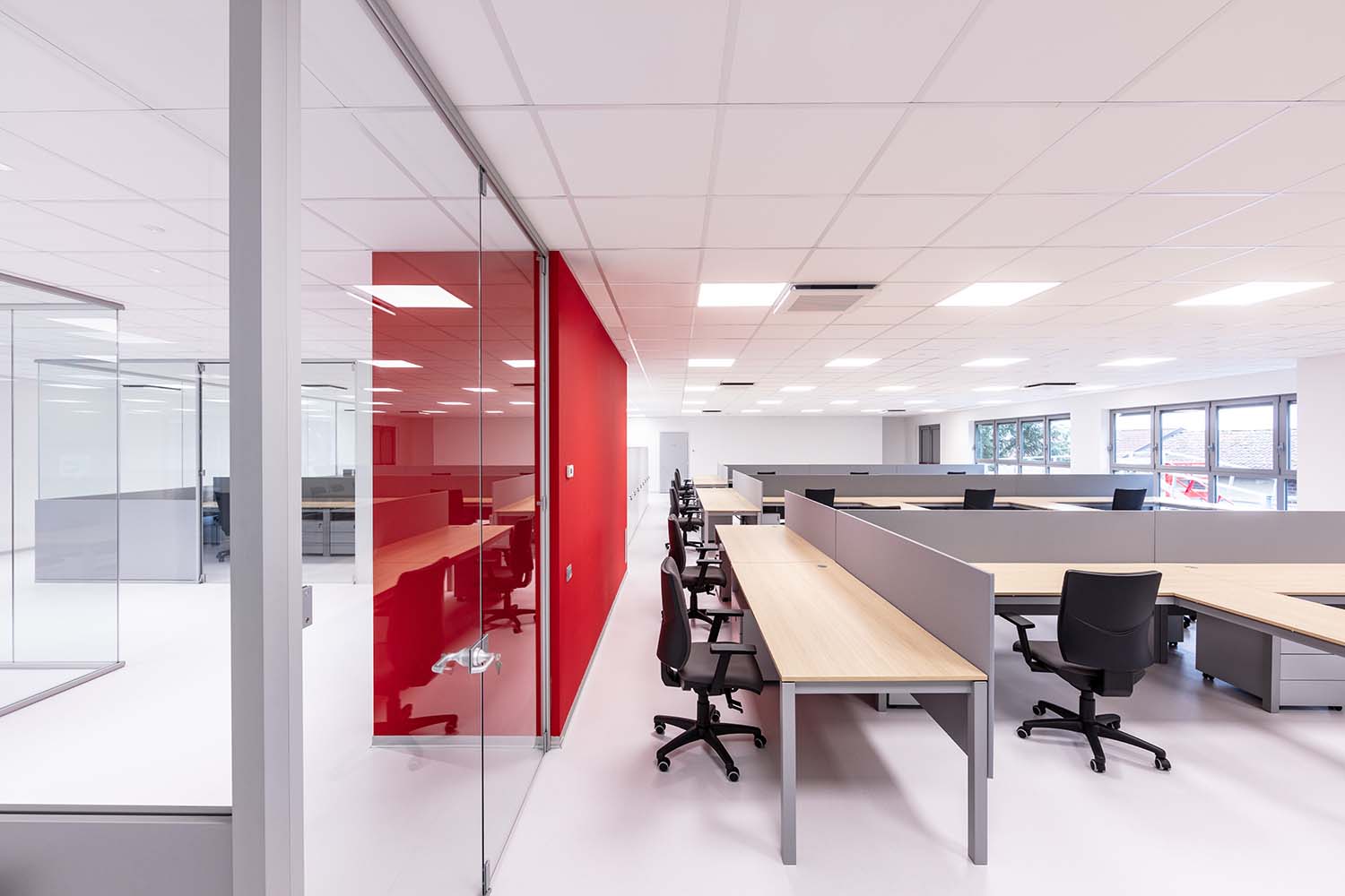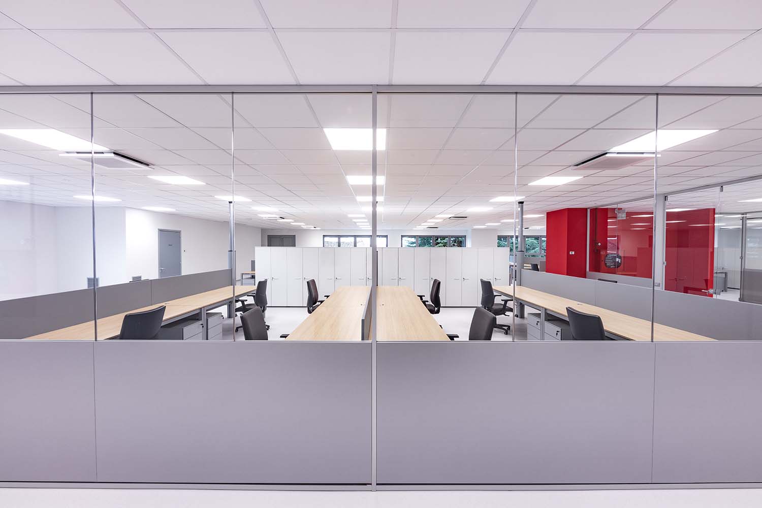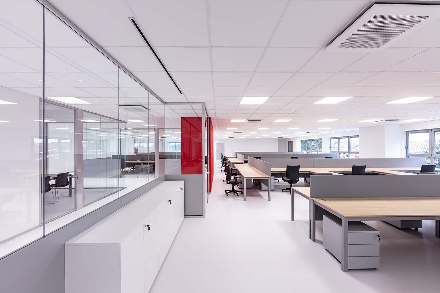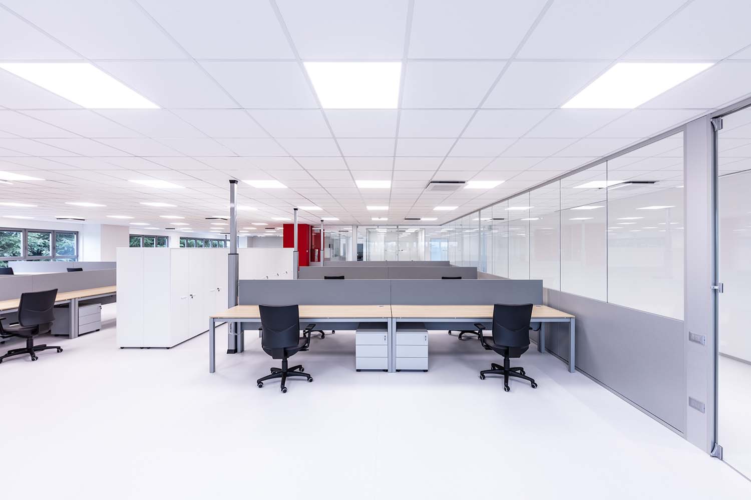 Vse prostore so ločevali s sistemom predelnih sten M3, ki jih odlikuje struktura s tankimi aluminijastimi stebriči in enojnim steklom, izmenjujejoč steklene stene polne višine z zidovi iz kombinacije kovine in stekla. V odprtem prostoru je nameščenih 51 delovnih postaj, sestavljenih iz pisalnih miz X4 z vrhom iz hrastove melamina (RK) in srebrno konstrukcijo, vsaka opremljena z metalno predalčno omarico in delovnim stolom Optima s črno konstrukcijo ter oblazinjenjem v antracitni tkanini B01. Za dopolnitev in optimalno opremo so bili nameščeni tudi kabineti iz bele melamina, ki hkrati služijo kot pregrade med delovnimi mesti.