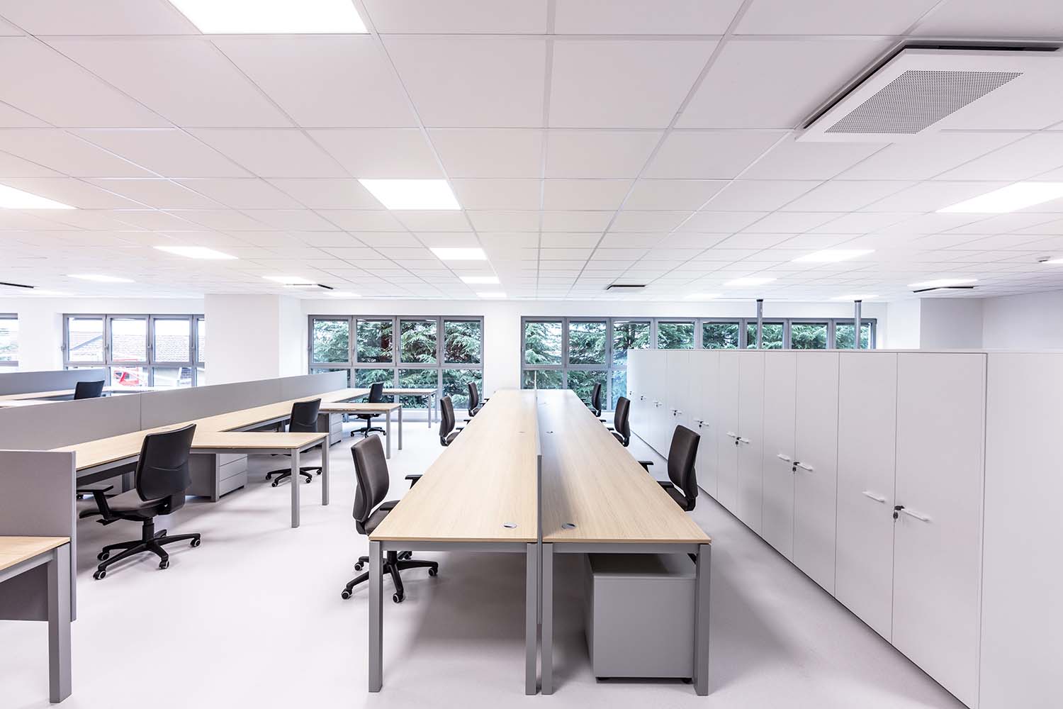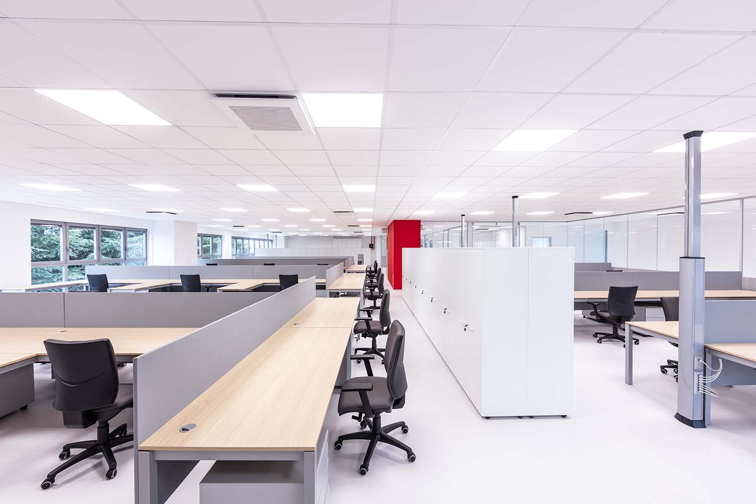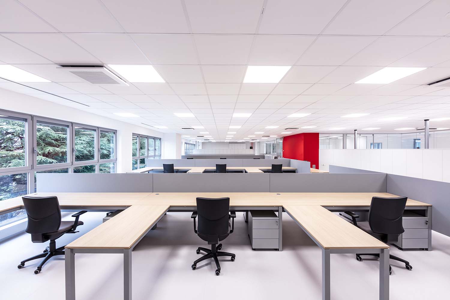 Vse prostore so ločevali s sistemom predelnih sten M3, ki jih odlikuje struktura s tankimi aluminijastimi stebriči in enojnim steklom, izmenjujejoč steklene stene polne višine z zidovi iz kombinacije kovine in stekla. V odprtem prostoru je nameščenih 51 delovnih postaj, sestavljenih iz pisalnih miz X4 z vrhom iz hrastove melamina (RK) in srebrno konstrukcijo, vsaka opremljena z metalno predalčno omarico in delovnim stolom Optima s črno konstrukcijo ter oblazinjenjem v antracitni tkanini B01. Za dopolnitev in optimalno opremo so bili nameščeni tudi kabineti iz bele melamina, ki hkrati služijo kot pregrade med delovnimi mesti.