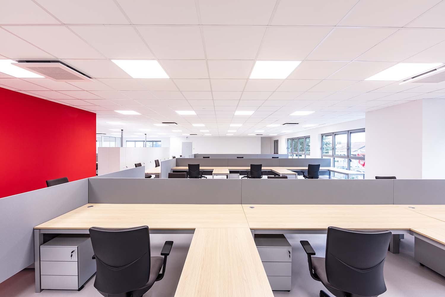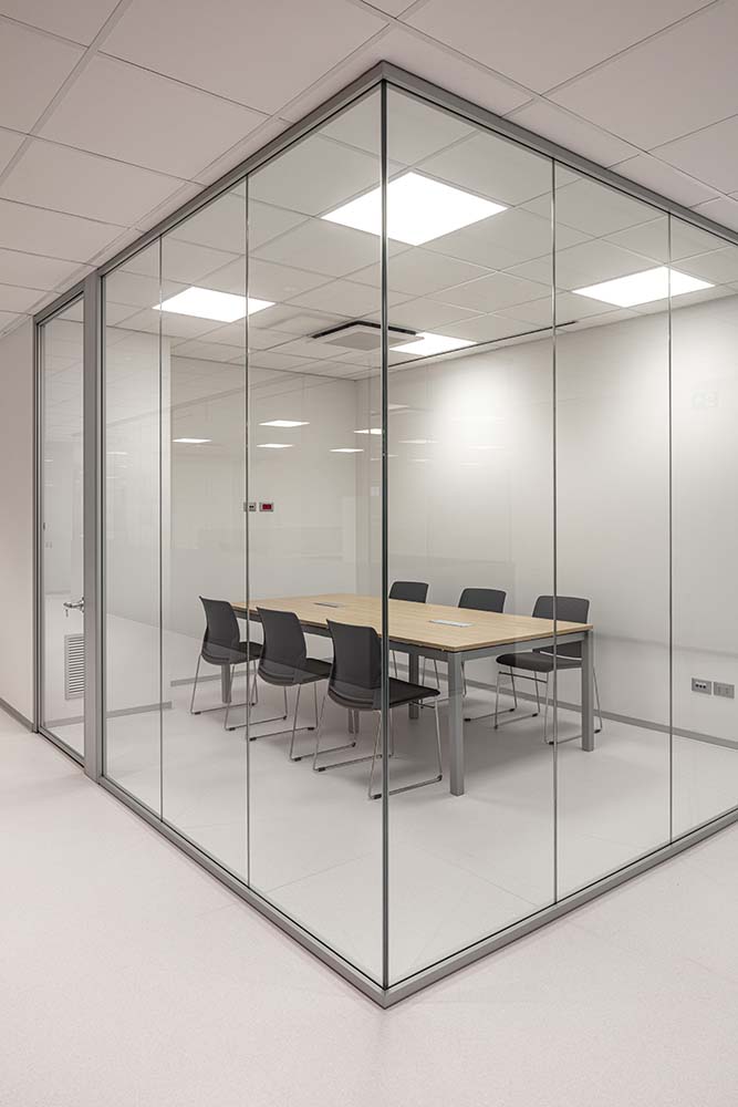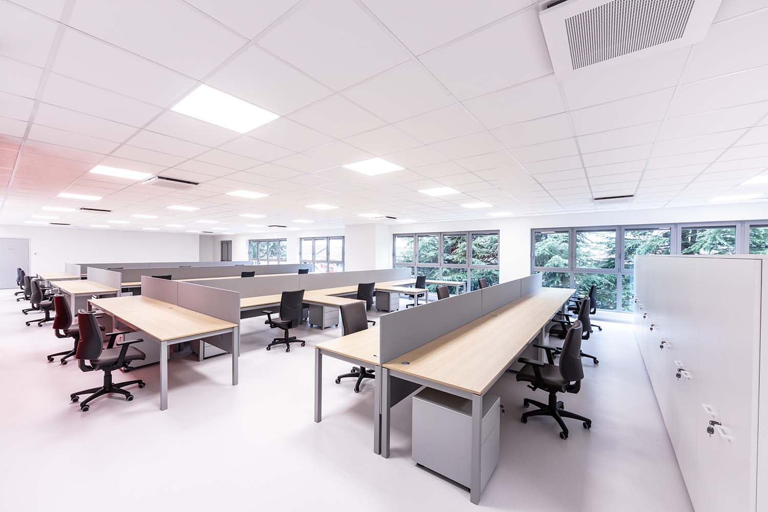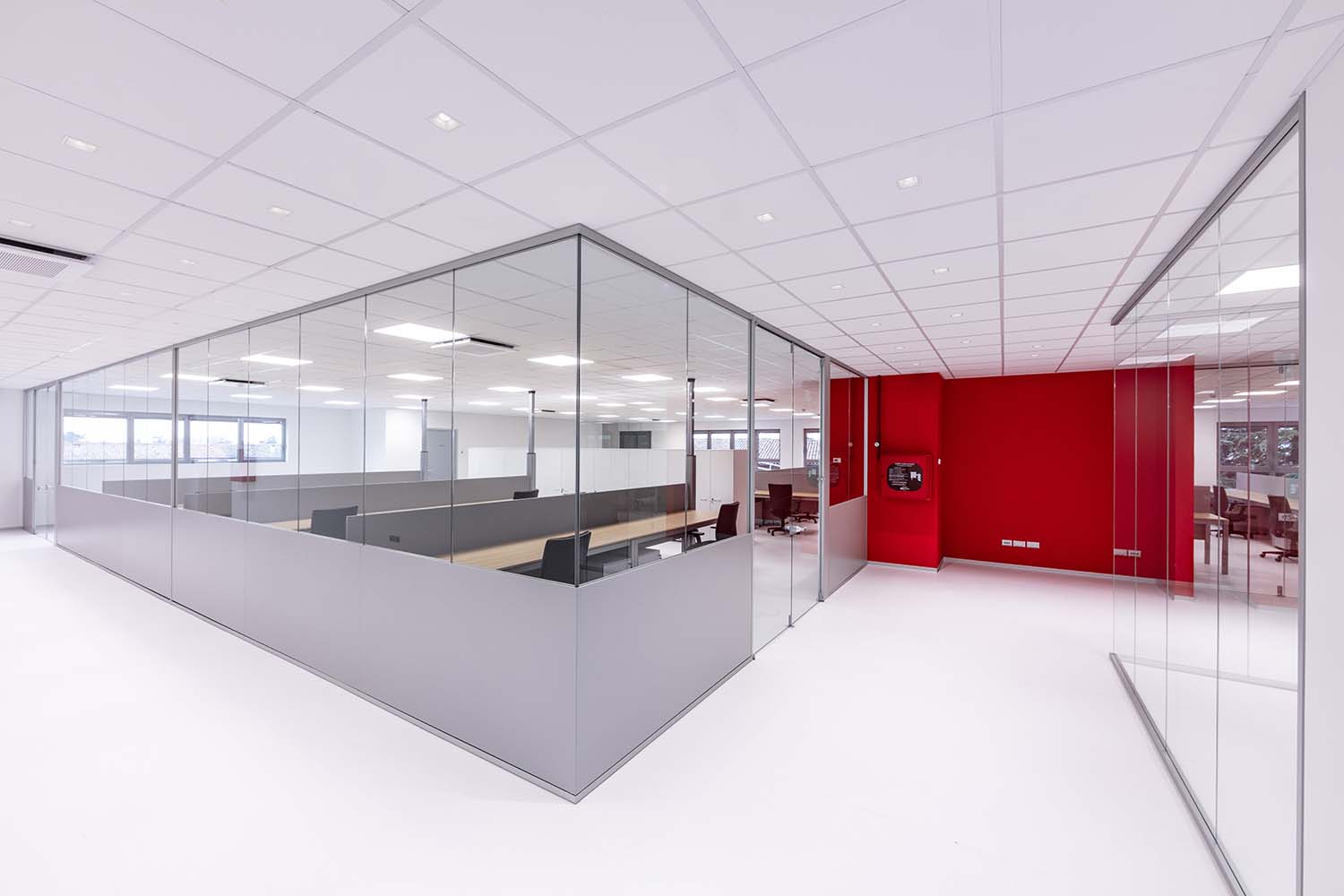 Vse prostore so ločevali s sistemom predelnih sten M3, ki jih odlikuje struktura s tankimi aluminijastimi stebriči in enojnim steklom, izmenjujejoč steklene stene polne višine z zidovi iz kombinacije kovine in stekla. V odprtem prostoru je nameščenih 51 delovnih postaj, sestavljenih iz pisalnih miz X4 z vrhom iz hrastove melamina (RK) in srebrno konstrukcijo, vsaka opremljena z metalno predalčno omarico in delovnim stolom Optima s črno konstrukcijo ter oblazinjenjem v antracitni tkanini B01. Za dopolnitev in optimalno opremo so bili nameščeni tudi kabineti iz bele melamina, ki hkrati služijo kot pregrade med delovnimi mesti.