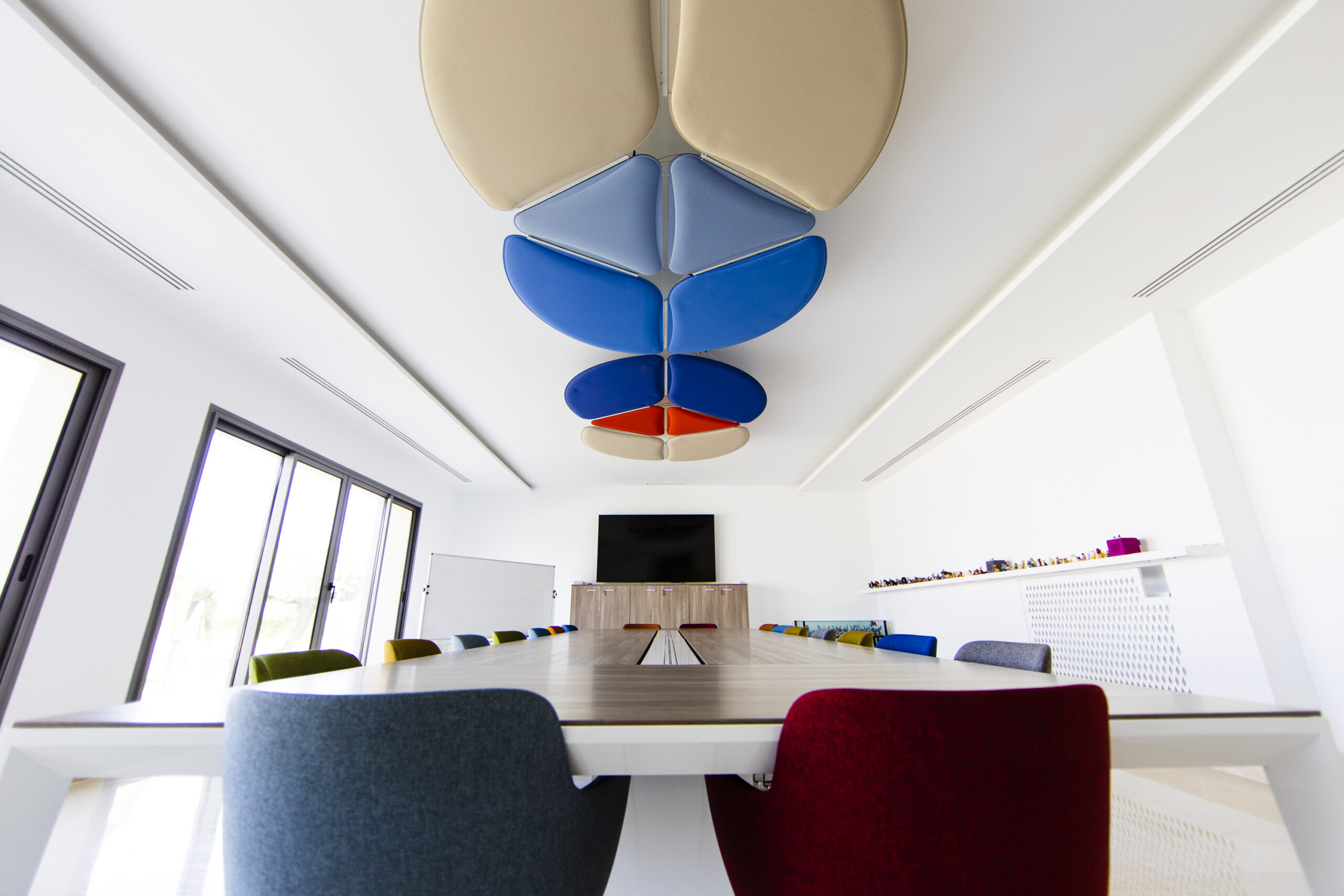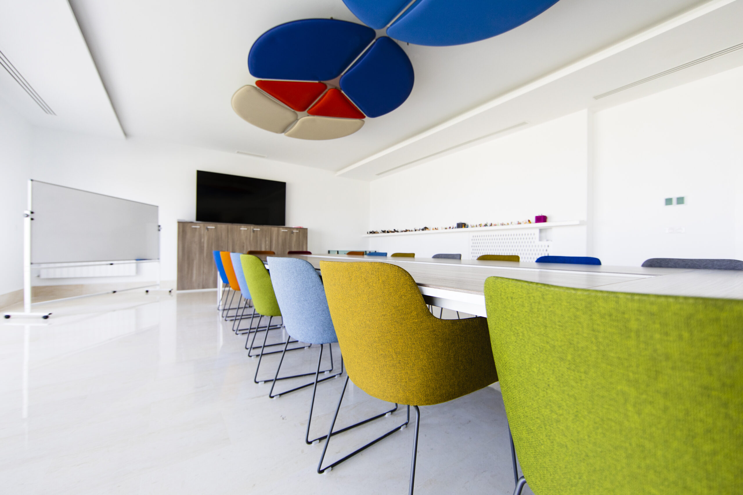 Začnimo s sejno sobo, ki ima največji vizualni učinek. Opremljena je z X5 sejnimi mizami, obdana s stoli City v osmih različnih barvah, ki so prisotni tudi v sistemu razsvetljave ter na akustičnih panelih Lightsound.