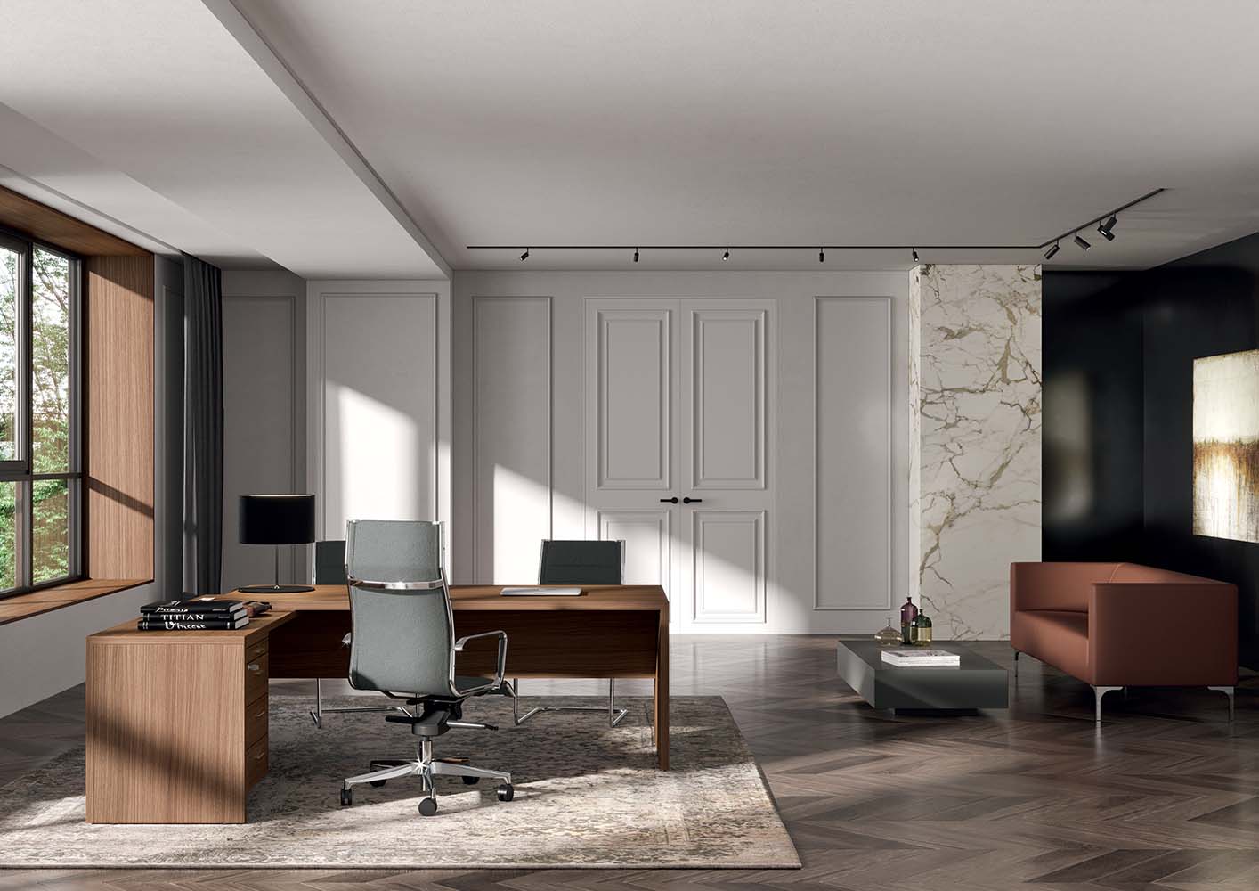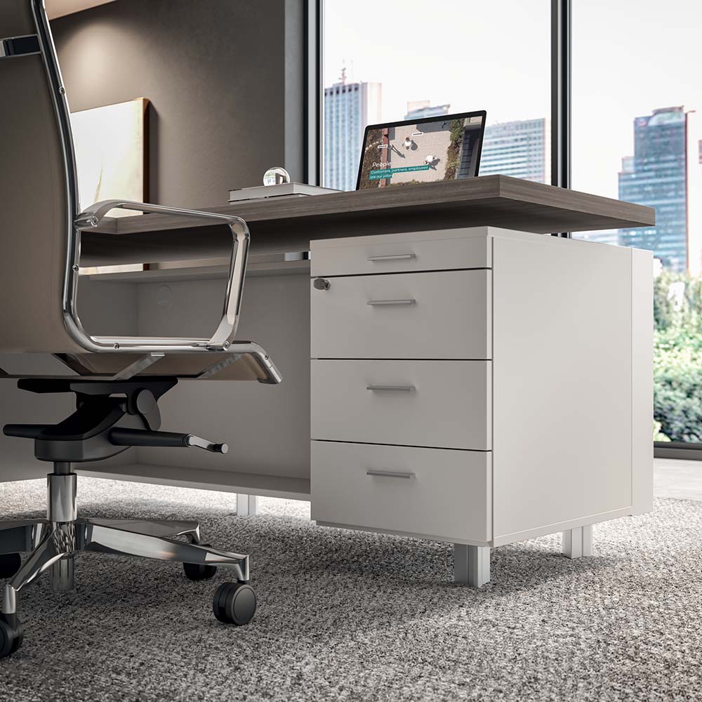 Izvršna različica vključuje vgrajen pisalni pult, ki ustvarja praktično L-obliko, idealno za delo ter sprejemanje partnerjev in strank. Tako delovna površina kot konstrukcija sta prilagodljivi, da ustrezata vsem okusom, ne glede na to, ali gre za klasičen ali moderen slog.