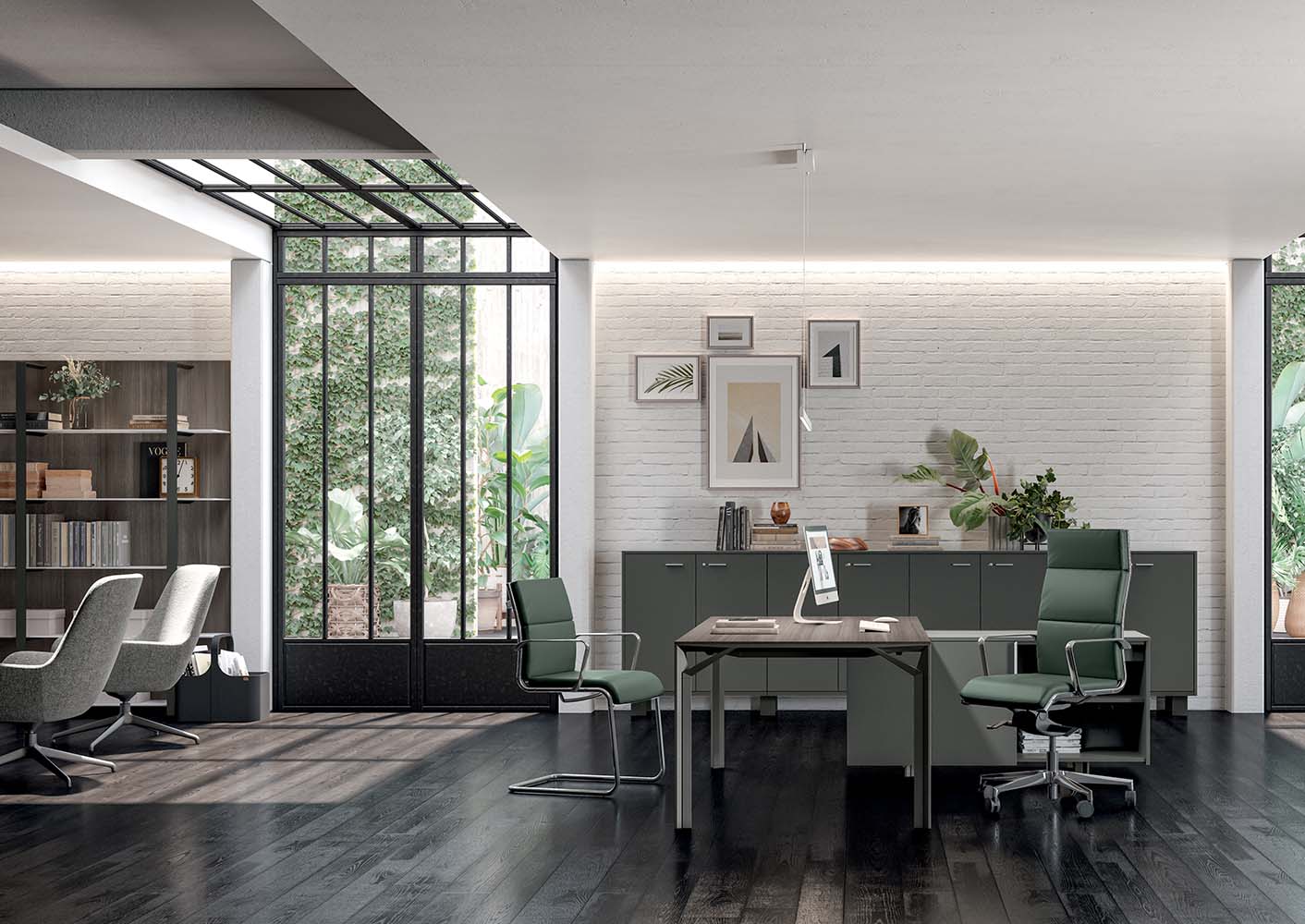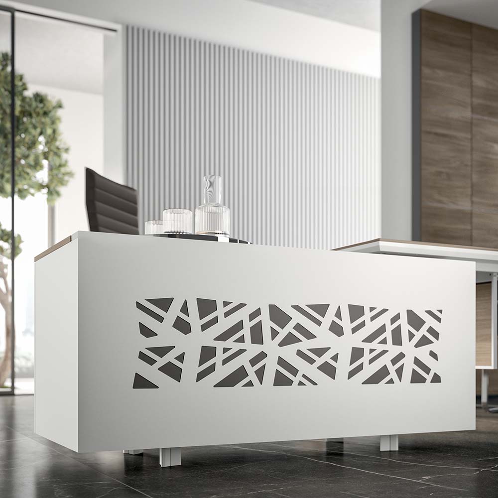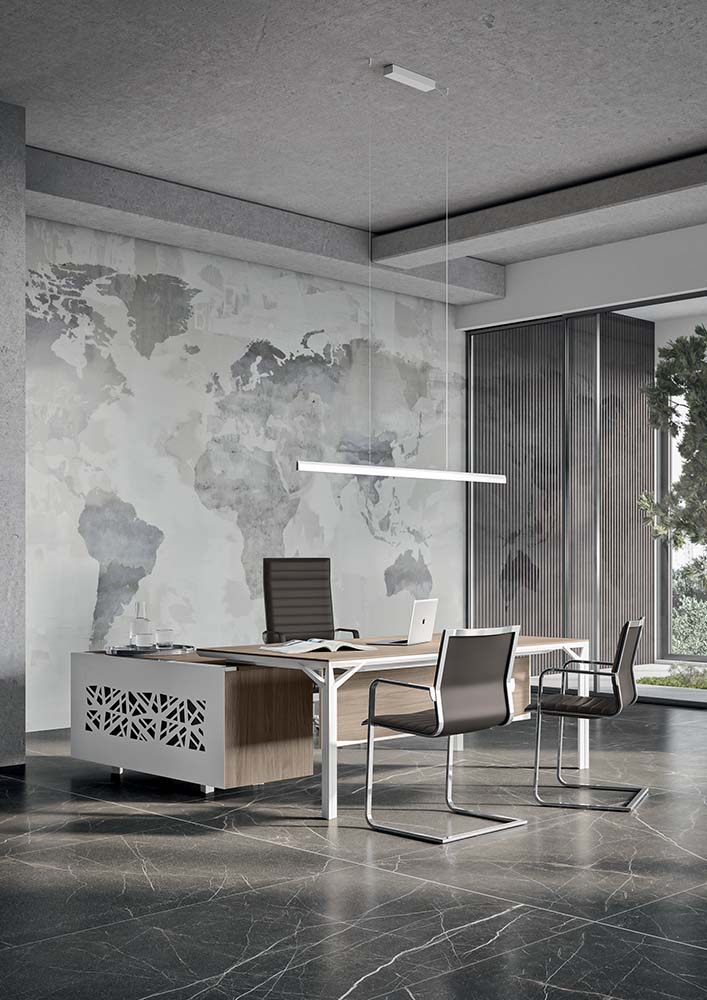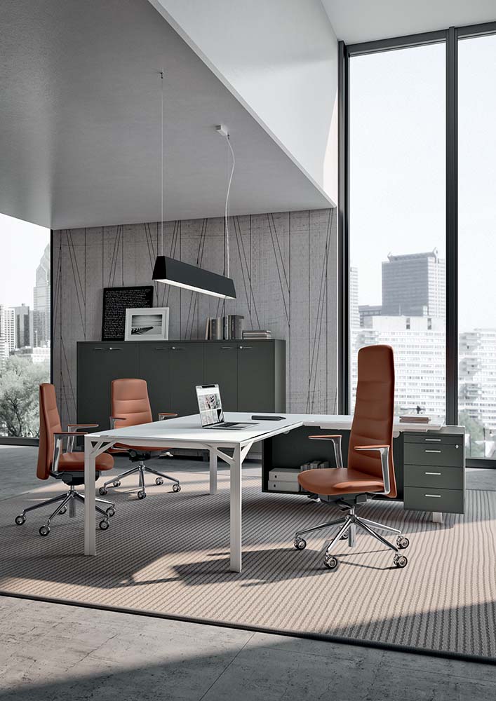 Oblika delovne površine je zasnovana tako, da zagotavlja red in praktičnost, zahvaljujoč funkcionalnim dodatkom, kot so organizatorji kablov. Mizo je mogoče dopolniti z modulom za shranjevanje osebnih stvari ali arhiviranje dokumentov. Izvršna različica z dodatnim pisalnim pultom ustvarja obliko črke L, ki je praktična za delo in sprejem gostov ter partnerjev.