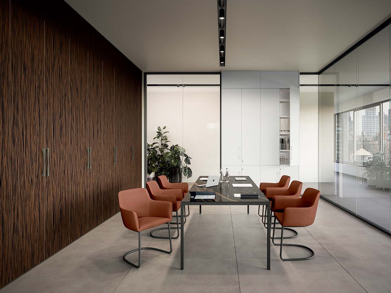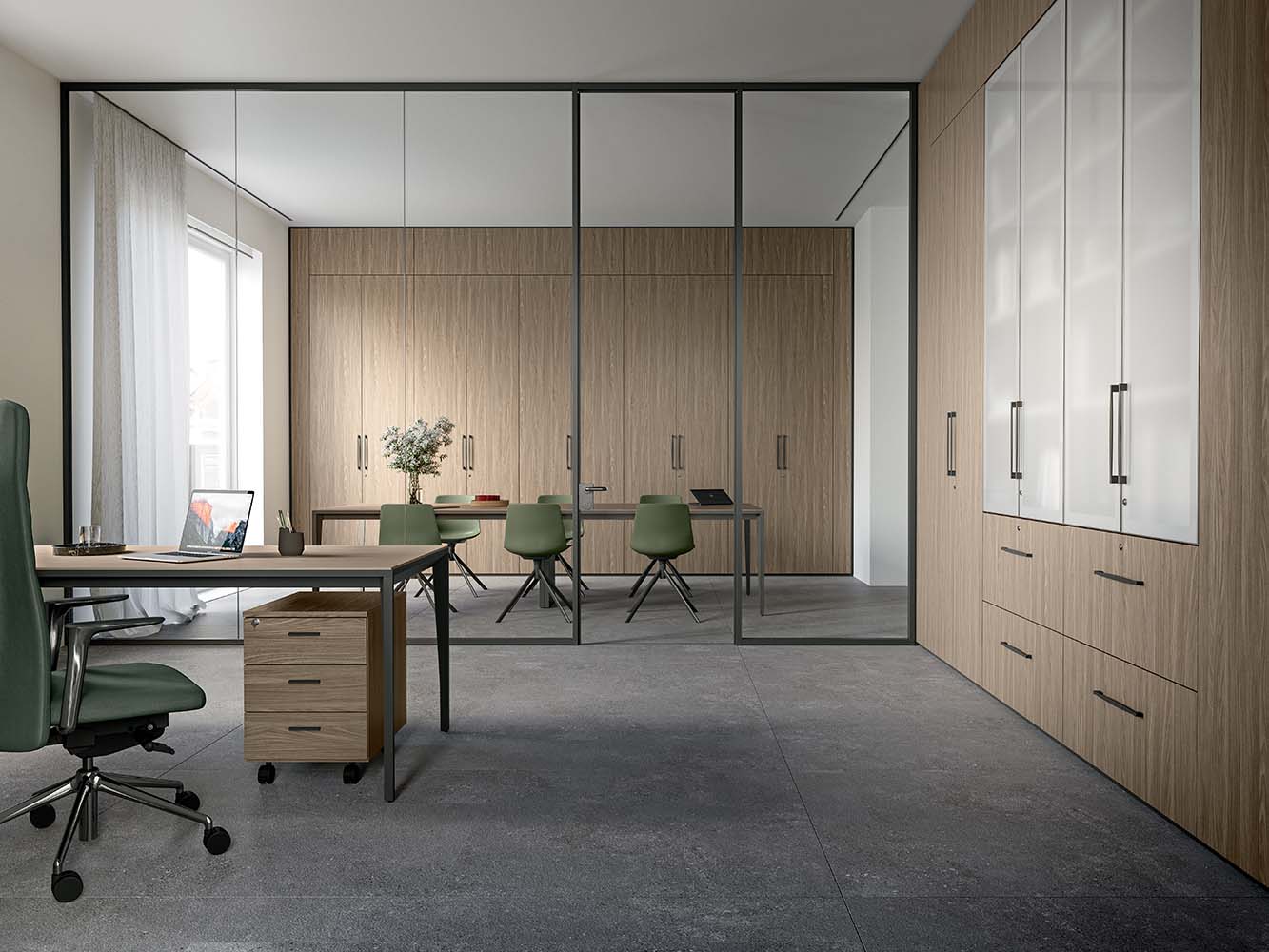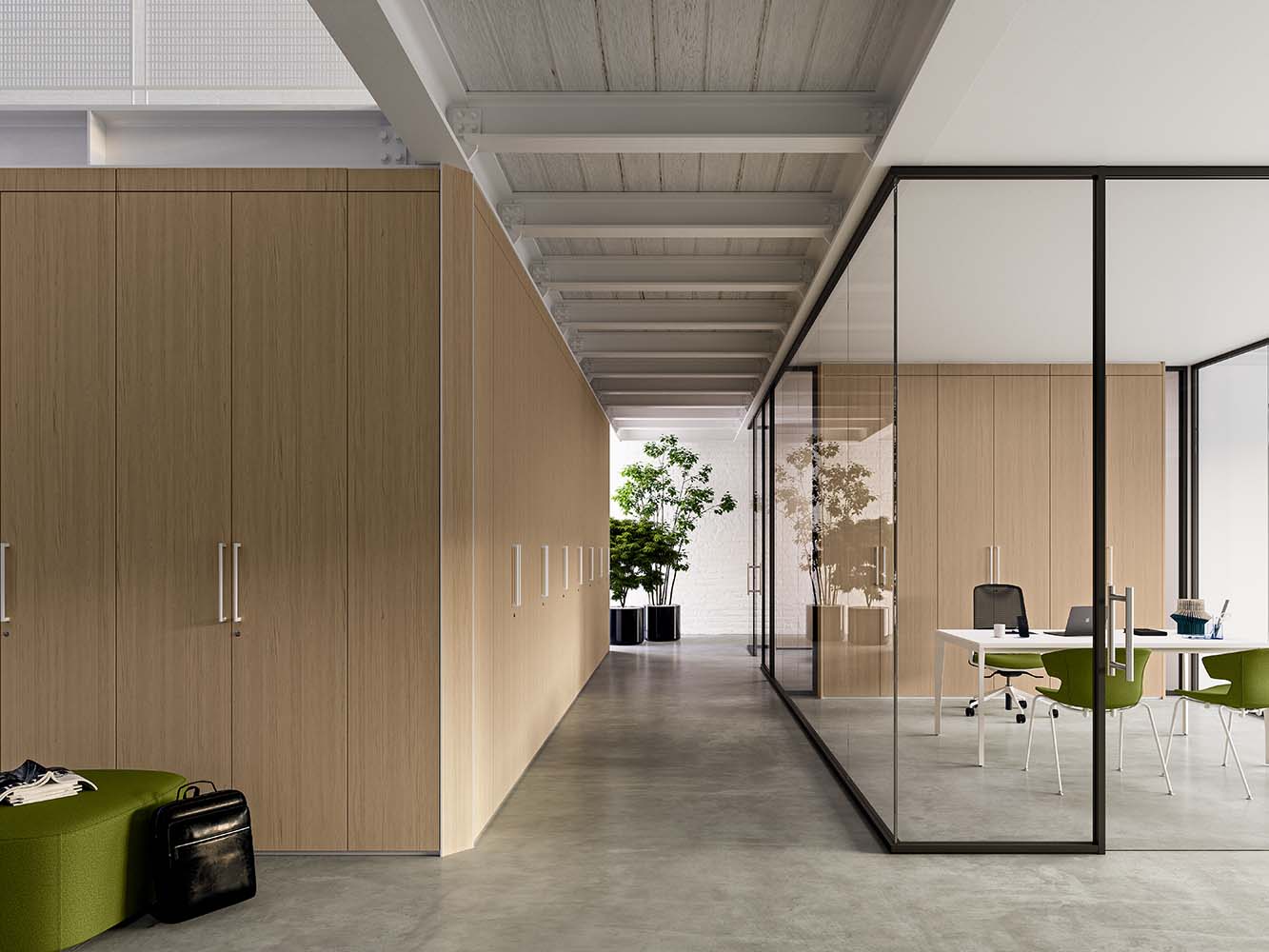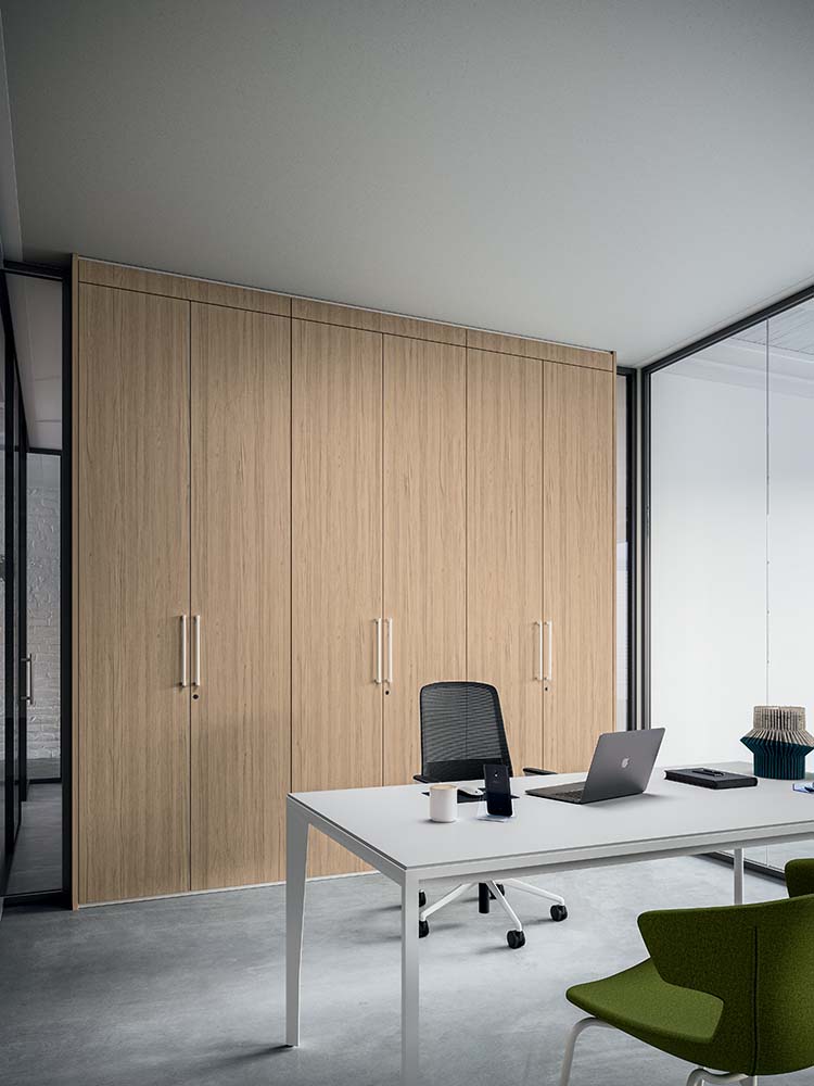 - Prilagodljiva Zasnova: Sistem omogoča popolno prilagoditev ciljnemu okolju. Stena S1 je na voljo v številnih barvah in materialih, vključno s steklom, lesom in melaminom. Ta vsestranskost jo omogoča, da se skladno vključi tako v operativne in skupne prostore kot tudi v bolj izvršilne pisarne z uporabo bolj institucionalnih in elegantnih zaključkov.