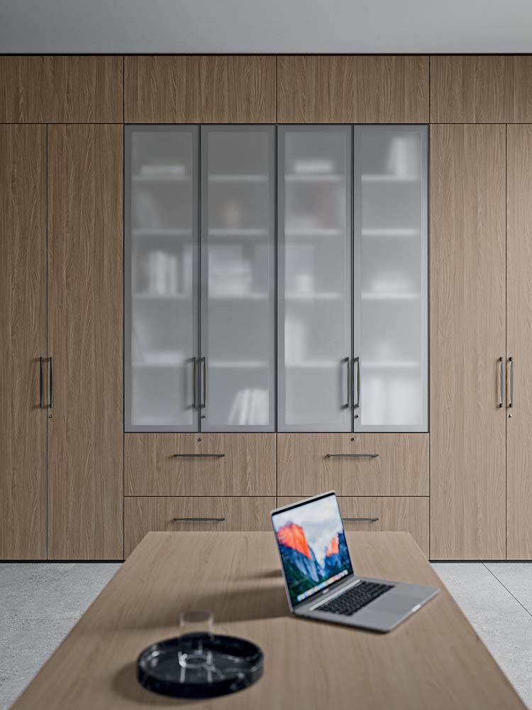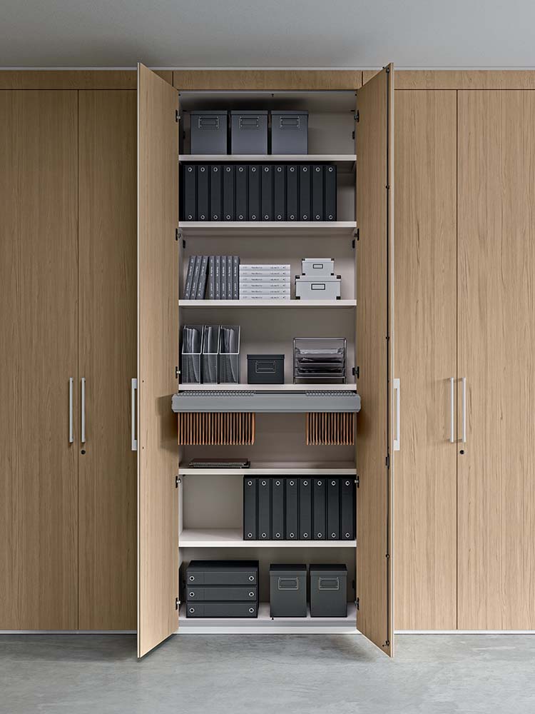 - Urejenost in Optimizacija Prostora: Sistem S1 je opremljen z bogato paleto funkcionalnih dodatkov, kot so police, držala za mape, izvlečni predalniki, shranjevalni prostori in obešalniki. Ti dodatki zagotavljajo racionalno, urejeno in optimizirano razporeditev predmetov in dokumentov.