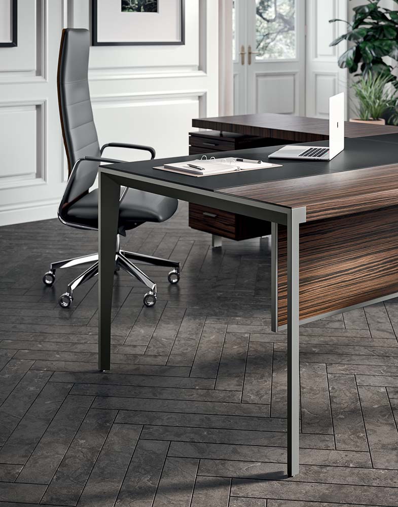 Ta direktorska miza ne zmanjšuje udobja pri delu, saj ima prostorno ploščo in pohištvene dodatke, ki so funkcionalni in pripomorejo k produktivnosti.