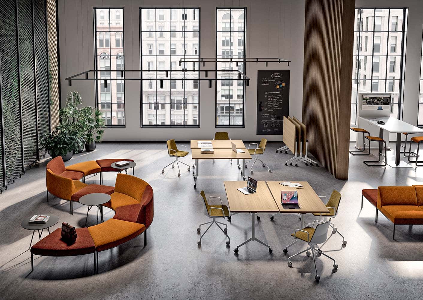 Zahvaljujoč kolescem na nogah, lahko Pop-Up premikate v le nekaj preprostih korakih in ustvarite neformalne sejne prostore, prostore, primerne za izobraževanja, ter preprosta samostojna delovna mesta v odprtih prostorih.