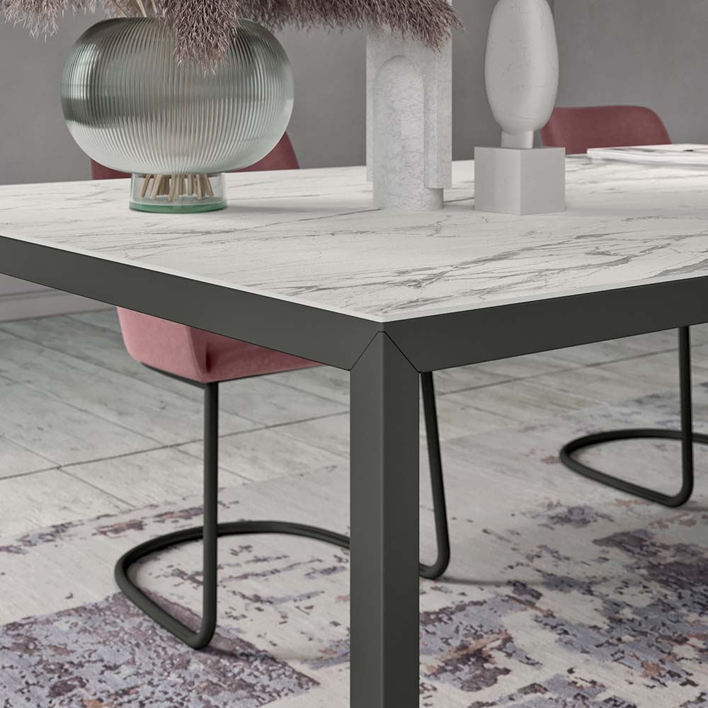 Kolekcija je vsakič edinstvena zahvaljujoč prilagojenim finim zaključkom, kot je porcelanasta kamnina, ki poudarja prefinjene noge iz kovinske pločevine.