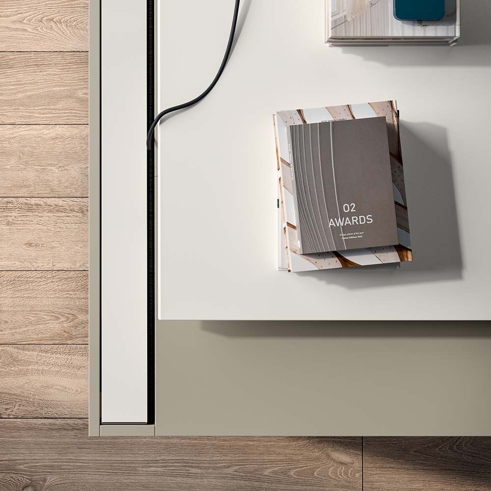 Ključna značilnost te mize je združitev vitke in tanke površine s konstrukcijo v enojnem zglobnem sponki, ki ustvarja učinek komplicirane fuzije.