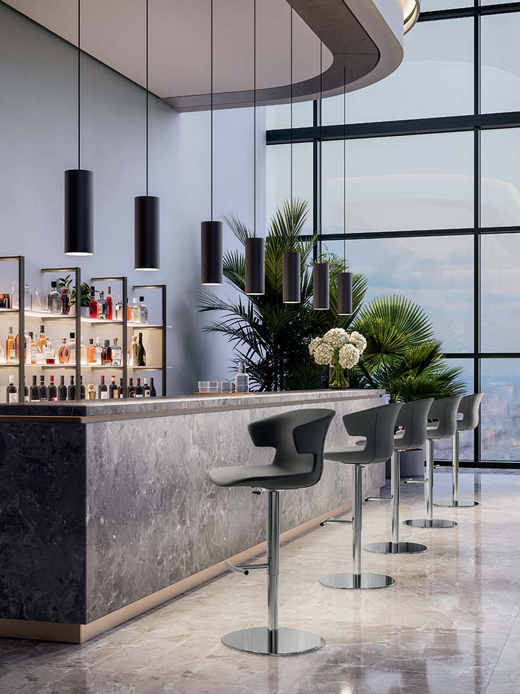 Različica stolčka, na primer, je namenjena gostinstvu in druženju v bolj neformalnih in “odprtih” okoljih. Sedež z oblazinjeno ali polipropilensko lupino je udoben, trden in funkcionalen, tudi zaradi vrtljivega podnožja z nastavljivo višino, ter je idealen za zasebne domove ali ekskluzivne prostore.